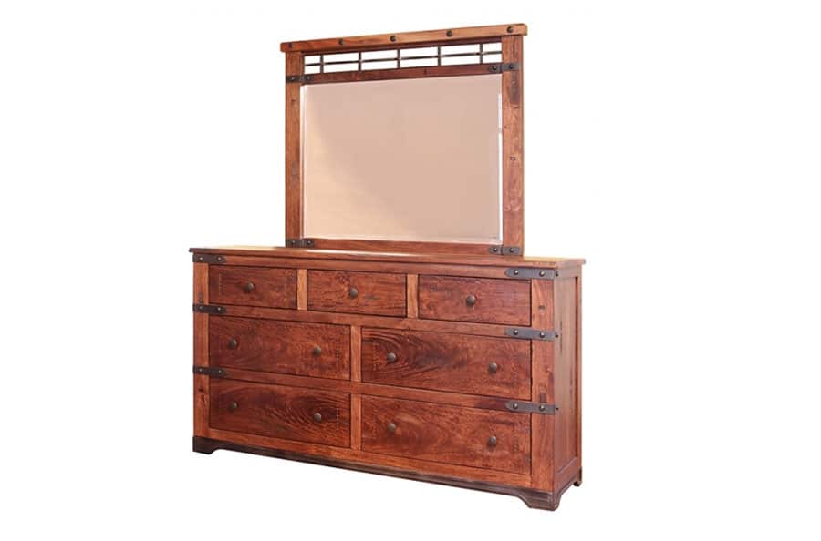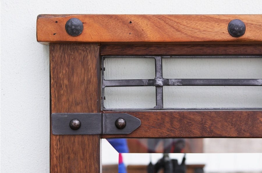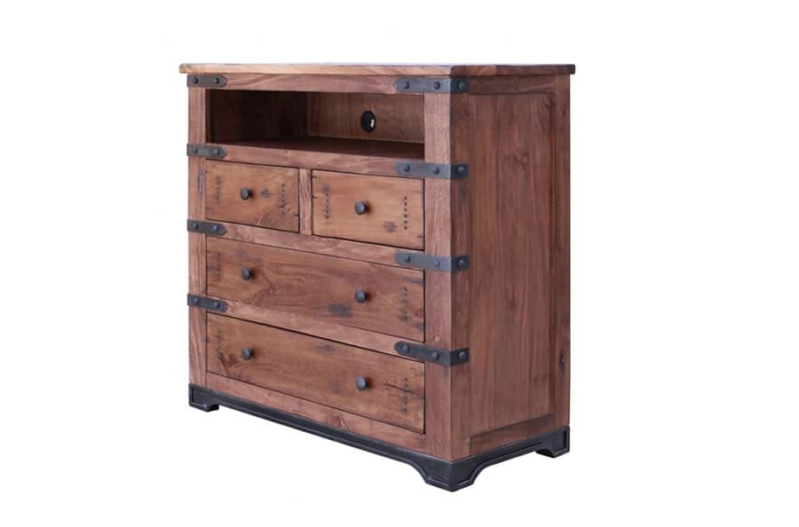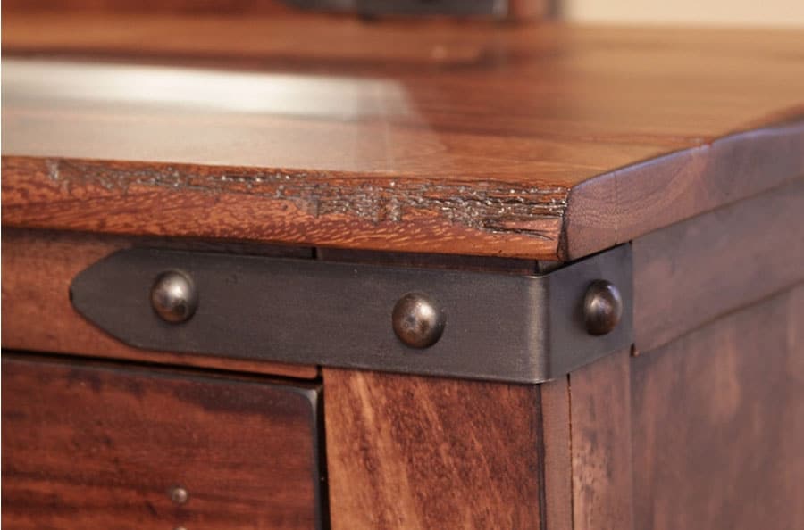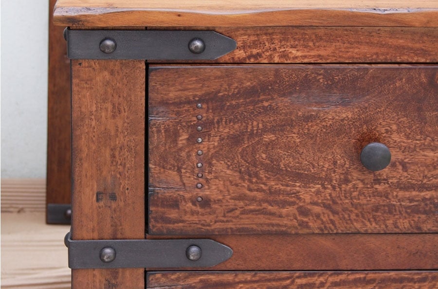 4. Drawer fronts are solid mango wood, with a hand inserted rust finish nails and cast iron pulls.