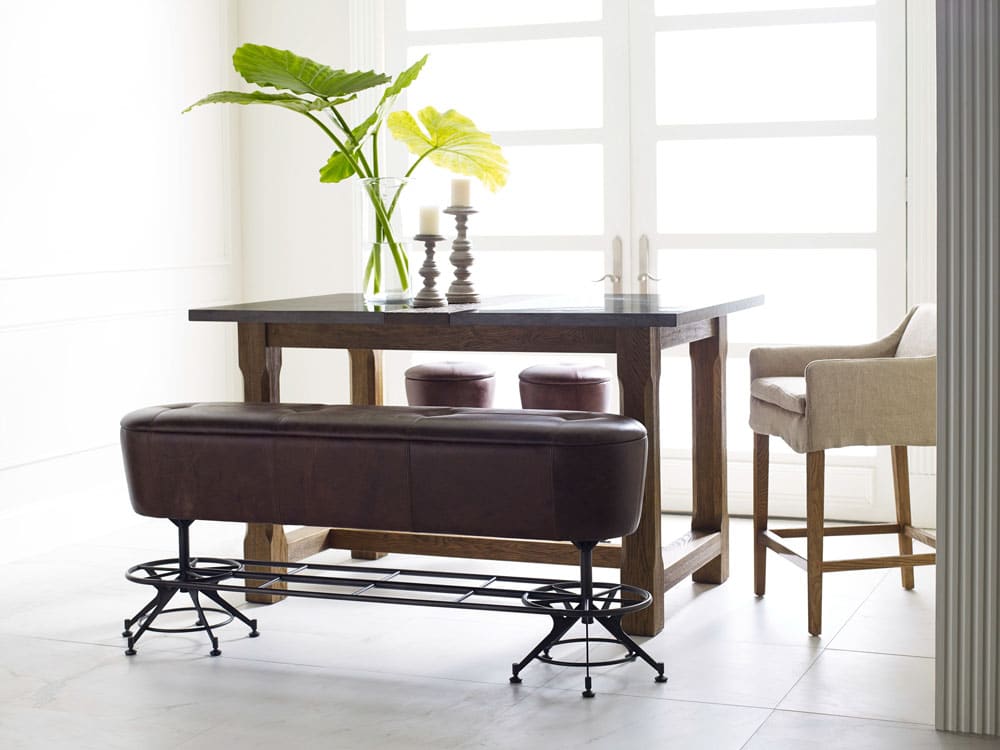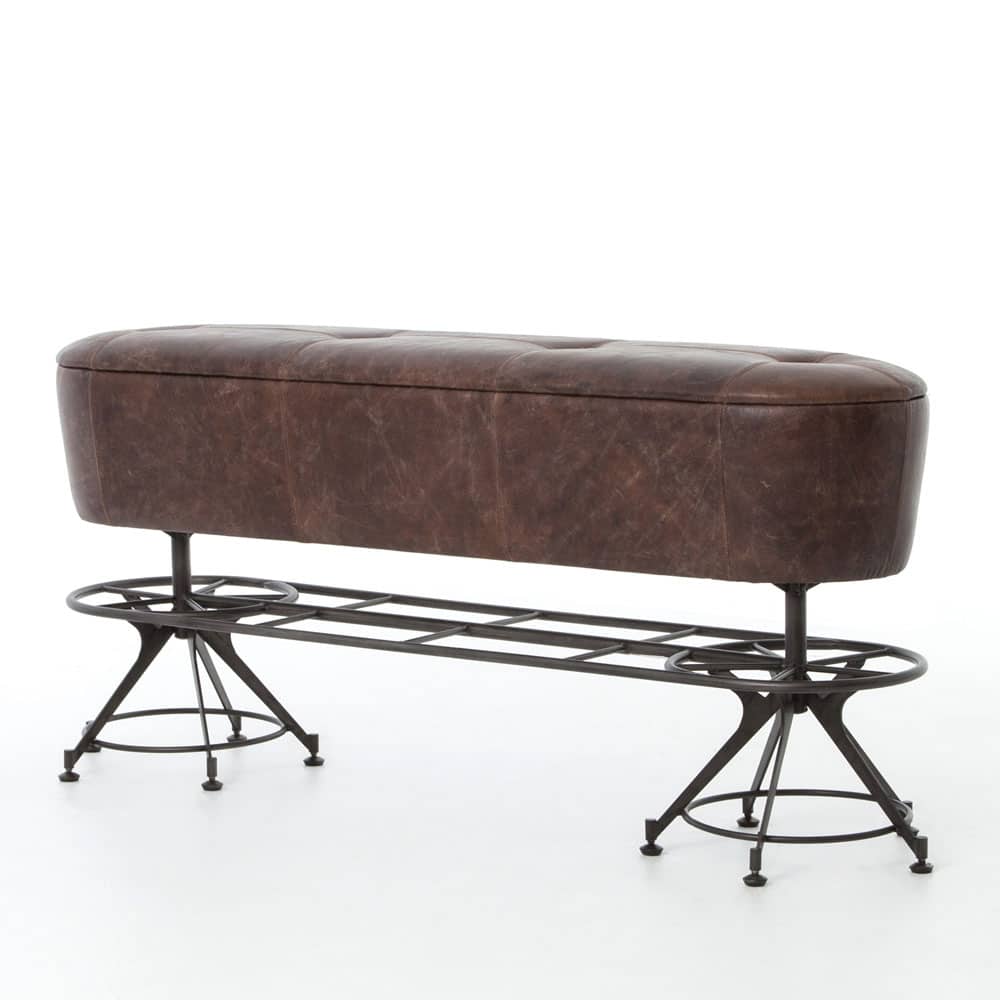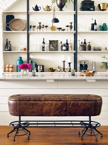 Inspired by a pommel horse found in a classic gym, this leather bench happily seats two to four at any get-together.