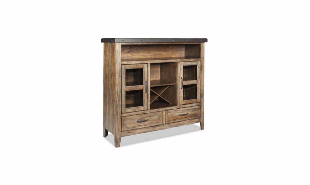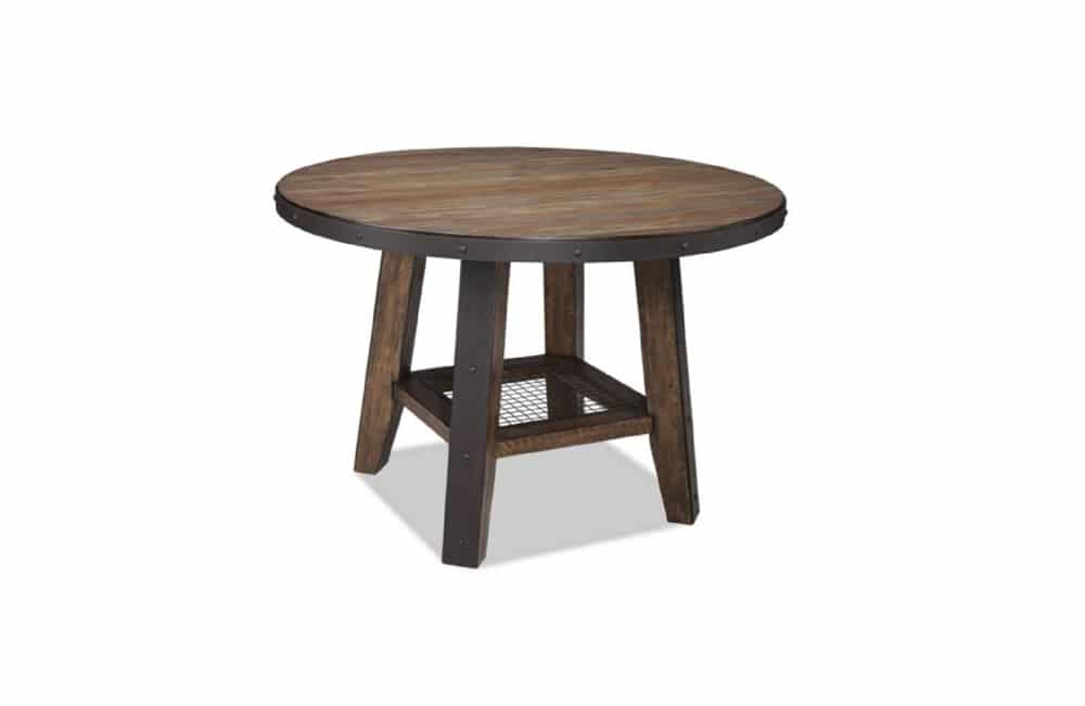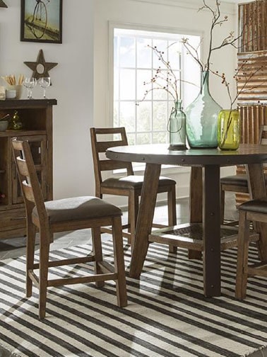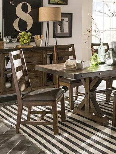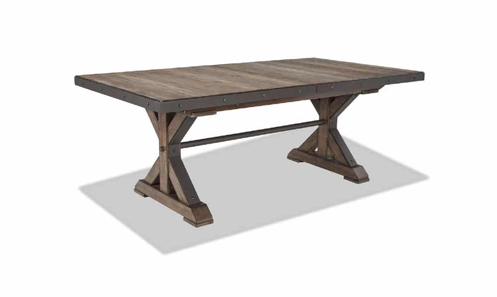 This rugged transitional table combines thick spruce veneers and hardwood with metal accents to create a timeless dining room look.