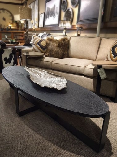 This ellipse shaped coffee table will add a modern feel to any living room. Made of iron and stained black, oak patina wood. Heavy and durable, this table is sure to be a longtime love.