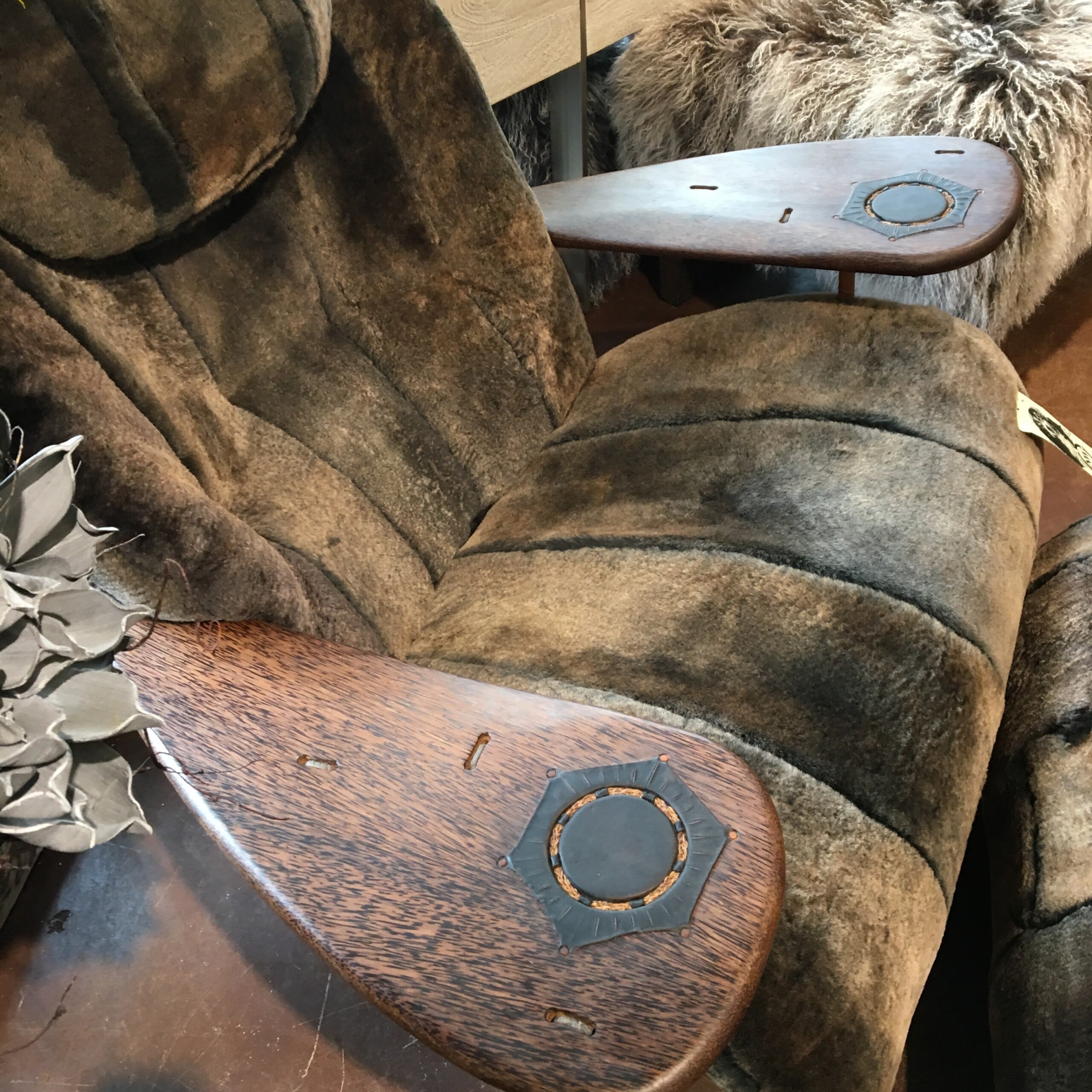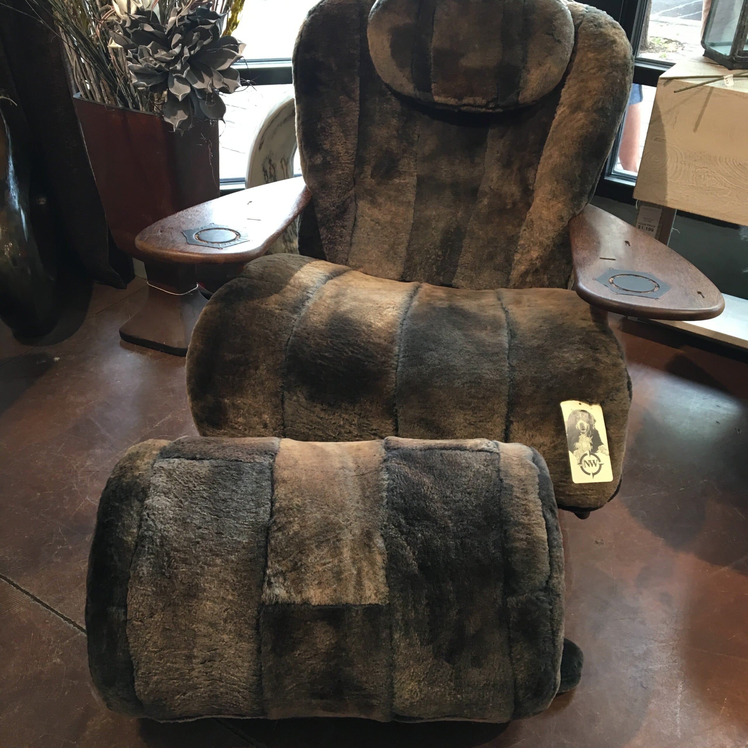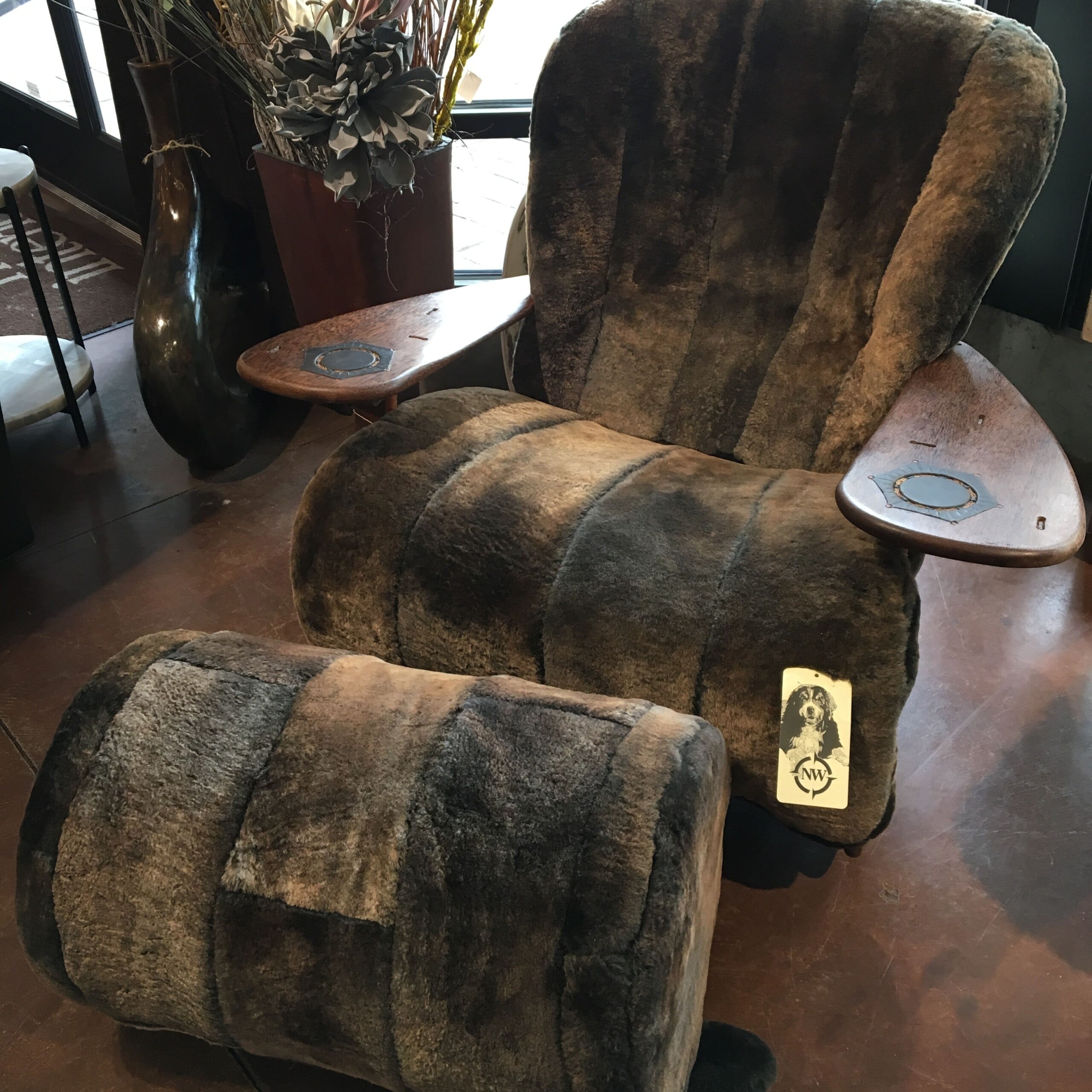 Elegantly crafted hair on hide wool rocker with a rolling foot rest. Beautiful wood arms and back.
