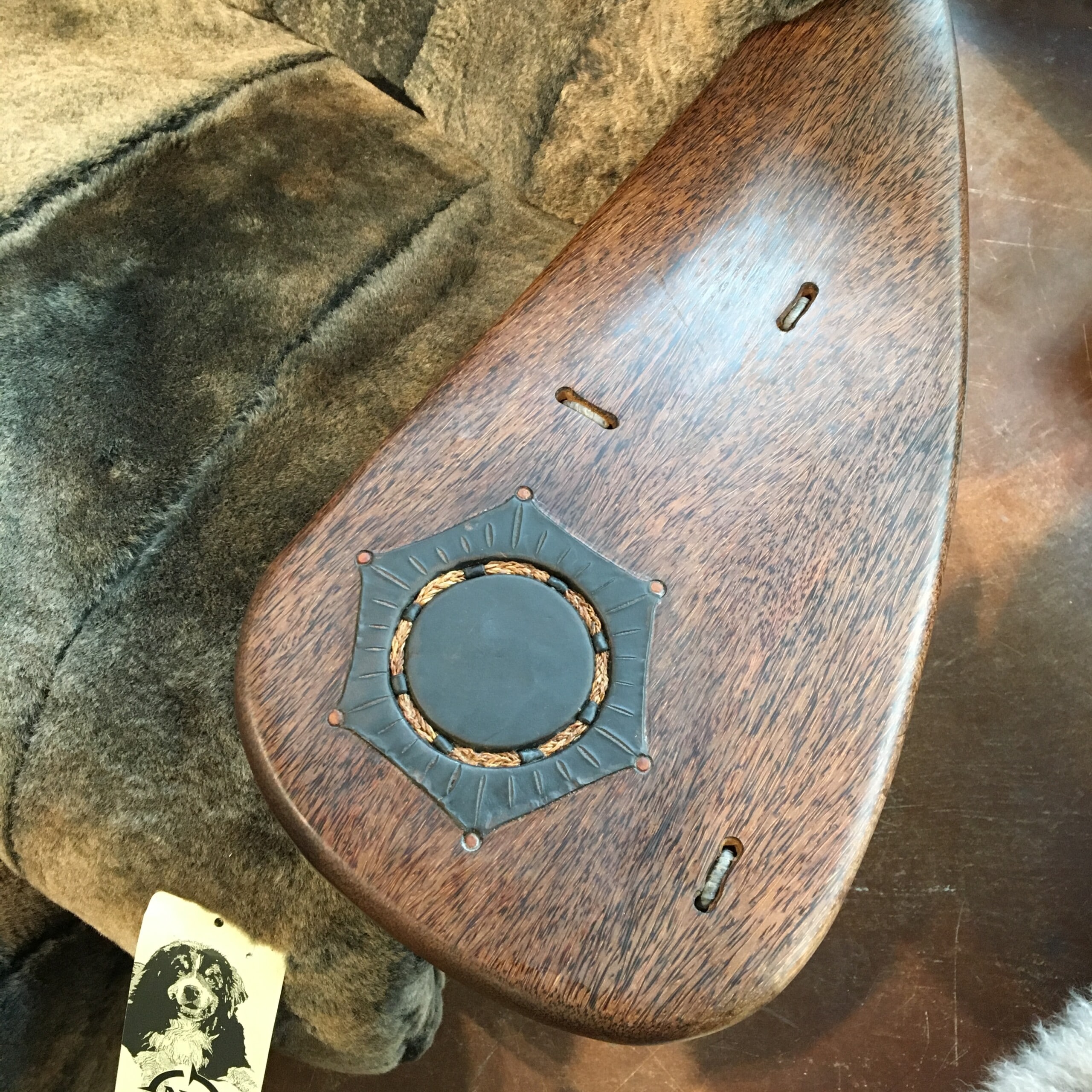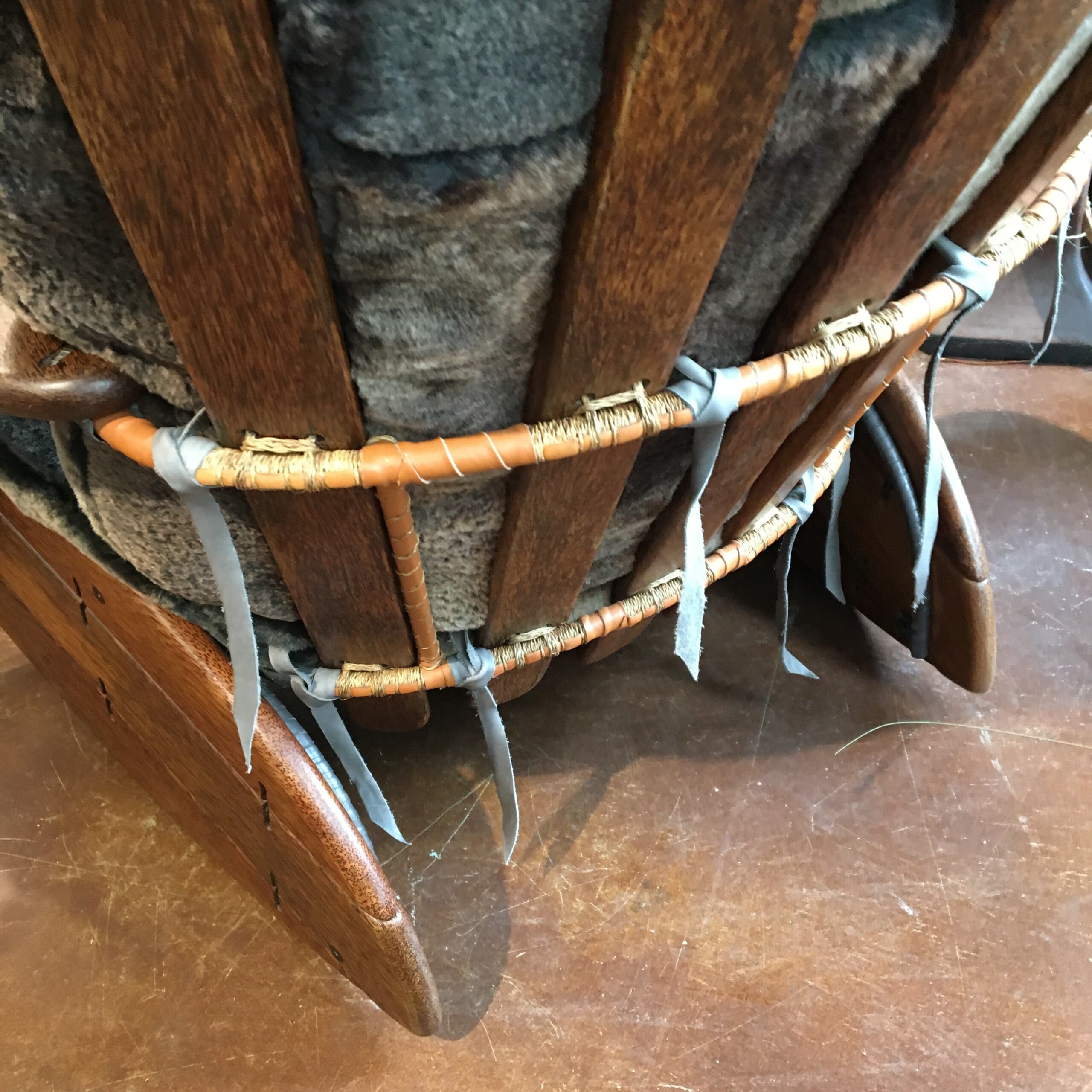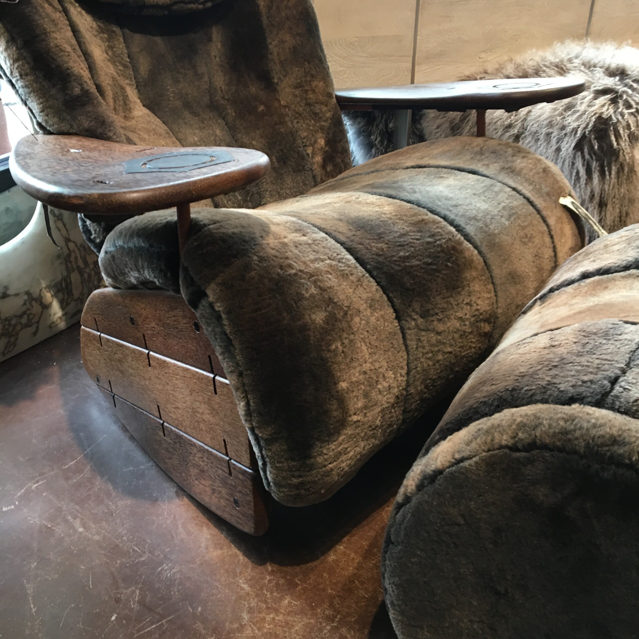 Elegantly crafted hair on hide wool rocker with a rolling foot rest. Beautiful wood arms and back.